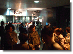 会場のNBCビデオホールまでは電停1つ分の距離なので歩いて向かうことに。途中、ノートPCで映像を公開しながら、そしてそれを見ていたtomohikoさんから道のりを確認していただきながら進む。しばらく歩いて会場に到着。すでにたくさんの人が集まっていた。その様子をヤフーメッセンジャーの映像と音声でお届けできた(?)。とは言え、果たして映像をうまくお届けできていたかどうかは定かではない。ロイヤルホストでクリさんに預けていた幟を取り出す。1階入り口付近はたくさんの人で騒然としている。開場の時間が過ぎ1階のエレベーターに向かおうとしたとき、原田泰治さんが現れる。その後に続き、まっさんママと玲子さんが僕のすぐそばを通り、エレベーターに乗り込む。一足遅く一緒のエレベーターには乗れなかった。その次のエレベーターに乗り開場の階へ。エレベーターを降りすると予想通り人・人・人。正面には長崎の特産品らしきものがこの日限定として売られていた。チケットを取り出し、入り口を通る。持っていたポータブル電源が重かったのでスタッフに預けようとしたが、忙しそうだったので「(カメラではなく)普通のパソコンです」と言って問題なく通ることができた。席を探し、一旦荷物を置く。