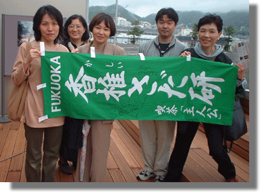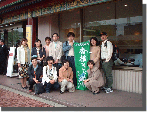 ) ごめんなさい)。原田泰治さんから福岡香椎さだ研の幟にサインをいただきました。原田さんがミュージアムを出られ、私たちも予定していた浦上の江山楼に向かうことに。外に出ると原田さんが外からしじみにとミュージアムを見上げていらっしゃった。僕の車にはPONさんとMakiさんが乗り込むことに。再び車のシガーソケットから電源をとりノートPCのカメラを前面に向け出発。