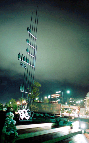 見ることができるようになっていた。1階の左奥の部屋と2階はスタッフルームらしい。一旦、車に戻りインターネットに接続。ヤフーのチャットルーム(チャット→エンターテイメント→音楽→ユーザールーム)で「さだまさし夜想曲」を開始。同時に映像も公開。しばらく休憩しているとhammerさん他のみなさんがが入室。ノートパソコン(バイオC−1)を持ったままチャット&映像公開しながら再度ミュージアムに入った。コンクリートに囲まれている建物中心部ではPHSの電波状態が不安定に。窓際に行くと安定した。雨はすでにやんでいた。再び車にもどり、き〜たさんにメール。その直後、♪モニュメント側の壁が開かれた。オープンされた1階フロアーは案外広かった。そのときちょうど、き〜たさん、クリさん、のこばぁさん、Makiさんと合流。ボランティアのスタッフが来場者からのメッセージ収録していた。引き続き会場の様子をチャット&映像公開を続けた。