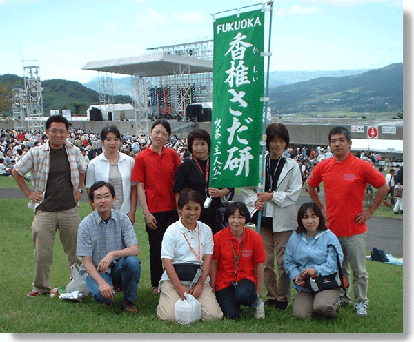 →終演後記念撮影(17:15)。太陽は西に傾き影が長く伸びている。以前香椎に住んでいて喫茶店「主人公」にも何度も足を運んでいたというかたも一緒に入っていただきました。