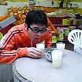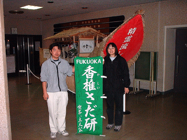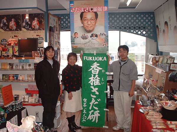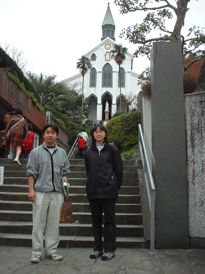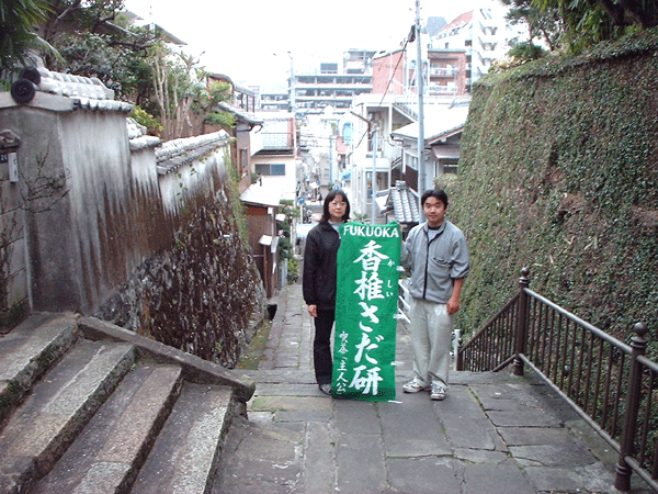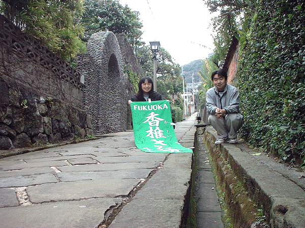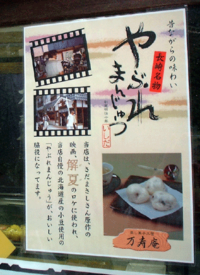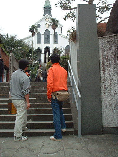 〜さだまさし遊援地〜」の大きなポスターが下げられていたのでそこで記念撮影。そしてドンドン坂の場所を教えていただいた。ドンドン坂手前のマリア園の情緒ある外観に感動。ここでも長崎の歴史を感じることができた。ドンドン坂の上のコンクリート壁にペンキで「ドンドン坂」と書かれていた。溝は三角。まっすぐのびたきれいな坂だった。坂上での撮影を終え、下ってみる。坂の下から見上げる坂は、映画のアングルそのままだった。パンフレットを確認しながら記念撮影。街灯はそれほど古くはないものの町並みにあわせて雰囲気のあるおしゃれなものになっていた。しかしそれに比べて電柱・電線に工夫がなく残念だった。坂を下りて右にまっすぐ行くと大浦天主堂の下に出てきた。せっかく来たので大浦天主堂をバックに記念撮影。川添さんお気に入りのザボンジュースを近くのお店で買い、飲みながらちょっと休憩。カステラのお店でお土産を買う。![]() ![]() 13:46 大浦天主堂前にて ![]() (携帯電話で撮影)13:47 待望のザボンジュース購入。 |