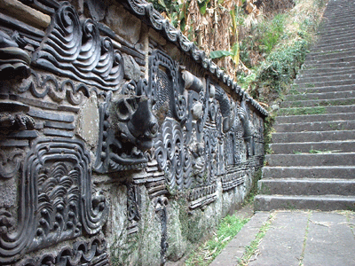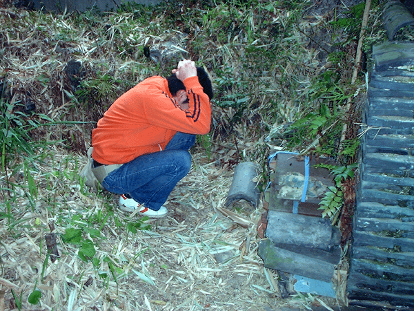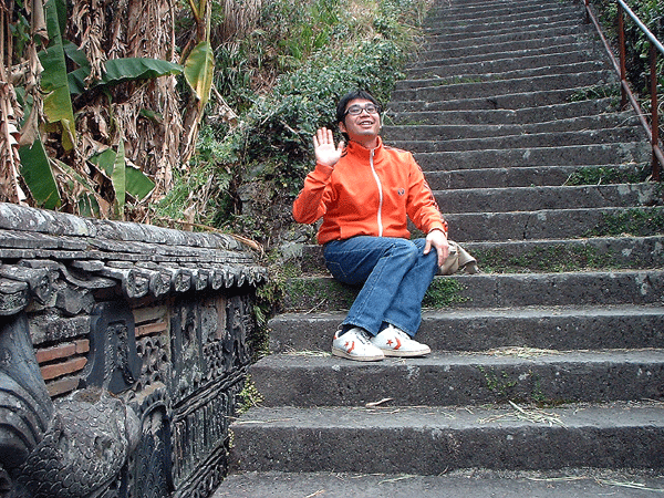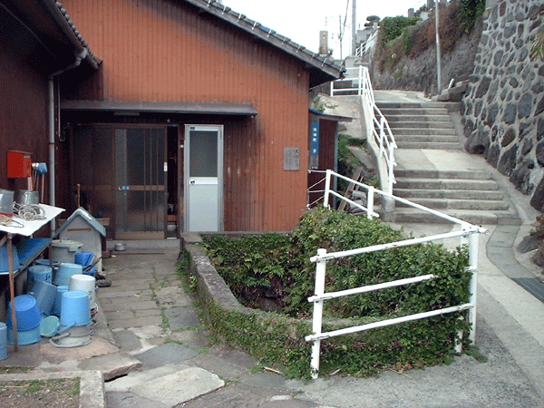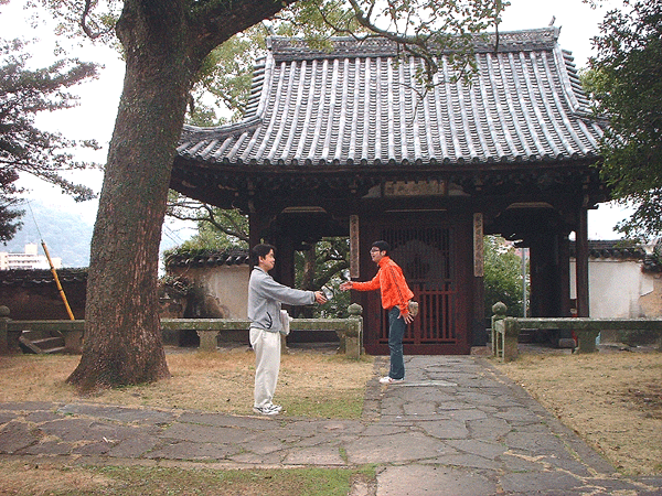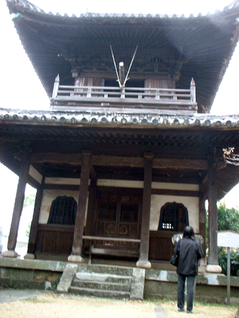駐車場に戻り車で万寿庵に向かうことにする。車の中で突然思いついて、途中で聖福寺に寄ることにした。寺の前の道は一方通行なので近くの100円パーキングに車を停めた。前回、遅くなって暗くてよくわからなかった鬼塀や階段をはっきり確認することができた。 また、隆之が少年時代にかくれんぼで遊んだその鬼塀の裏も撮影。映画の中で陽子が座っていた階段で記念撮影。その階段を上り、左にまがってしばらく歩くと井戸を見つけることができた。しかし、どうも映画で出てきた井戸とは違うような気がして、記念撮影はせずに外観だけを撮影。しかし、後でCSで放送されたメイキング映像で確認すると、その井戸が映画に出てきたものということがわかった。周りに猫が多いことに気づく。井戸の場所から少し先に進み、墓地に入った。気味が悪くなり戻ることに・・・・。川添さんの姿が無い。隠れているのか寺を出たのか・・・・・。境内を出るところで鉄心の鐘を見つけた。川添さんを寺を出てすぐの道で発見。その時、映画の中で万寿庵横の階段の設定になっている場所がこの近くにあることを思い出した。少し先に行くとその階段をすぐに見つけることができた。早速記念撮影。駐車場に戻り次の目的地に向けて出発。