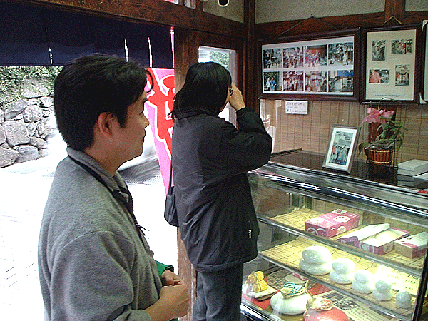 いしだや万寿庵は第二弾で訪れたが、時間が遅かったため閉店していた。その時、場所は確認していたので、今回はすぐに見つけることができた。駐車場がなかったので、ちょっとだけということで隣の家の駐車場に停めさせていただいた。中に入ると店員さんが迎えてくれた。あの「やぶれまんじゅう」は残り4つ。もちろん店内の様子を写真に撮る。解夏の話をしていると、それを聞いて奥の製造部屋からお兄さんが、ほほえみながら「そんなによかったですか?」と声をかけてくれた。 一緒に写真をお願いしたが断られて笑いながらお兄さんは奥に消えていった。そとで記念撮影をしようとするがなかなか車の交通量が多い。車がとぎれたところで急いで撮影。雨が降り始めた。 |