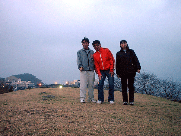 | どうやら車は山を登っているらしい。坂道が続く。なかなかいい感じではあったがどうも方向が違うような気がして交番で道を尋ねてみた。そこで風頭公園までの道のりを教えていただいた。Y字で中学校と逆の方に進み・・・・突き当たりを左に曲がりさらに突き当たりを左に曲がる。スポーツセンターを右手に確認して少し進むと右に上る坂があり、その坂を進むと案内板がある。一度途中で間違ったがなんとか教えていただいたとおり進むことができた。ホテル矢太樓の看板を見つけ駐車場に入ってみる。川添さんは小学校の修学旅行でここに泊まったらしい。 | ![]() 18:06 風頭公園のハタ上げ広場にて |