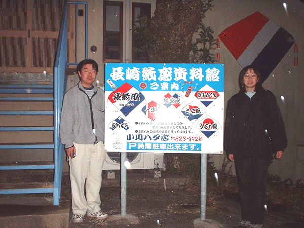 | いよいよ風頭公園に向かう。時間が遅かったためか入り口はチェーンがかけられていて車で中に入ることはできなかった。ふと右を見ると小川ハタ店「長崎ハタ資料館」を見つけた。すでに閉まっていた。とりあえず、公園入口のチェーンがかかったところに駐車して歩いて公園に入る。少し階段を上ると開けた場所に出た。園内見取り図看板で確認すると、そこはハタ上げ広場らしい。公園はまだ奥に続いているようだったが雨も降り出し、寒かったのでそれ以上は進まなかった。車に戻る。小川ハタ店は建物の2階部分になっているらしい。下が自宅になっているようで、窓から明かりが見えた。看板のところで記念撮影。 稲佐山ではスカイウェイに乗り山頂に向かった。往復500円/人。展望台のレストランは営業していないようだった。 雨に濡れてしまい体も冷えたので天然温泉イオスに行くことにした。お風呂の中で20:00を過ぎた。ゆっくりできたところで、イオスを出て稲佐山を下りた。有料道路に入る手前でパスタ屋さんで夕食。帰路についた。 2/29 0:15帰宅。走行距離312キロメートル |