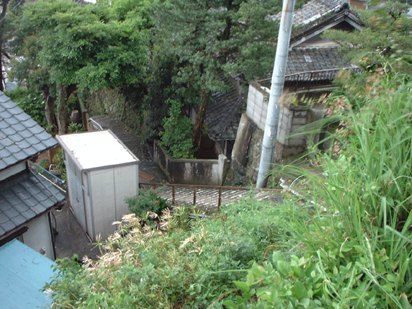 3人が訪れた長崎の港を見下ろす公園(鳥岩神社境内)の横の階段