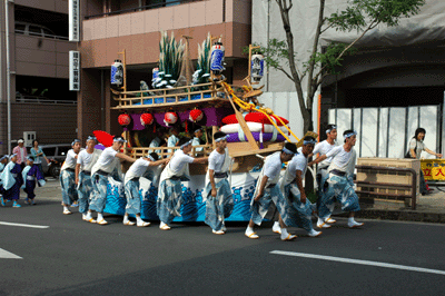 7年に一度の魚の町の山車「笠鉾・川船」。自由飛行館前にて。 |