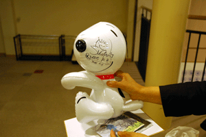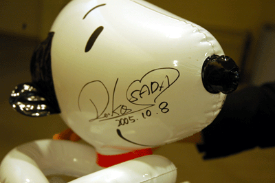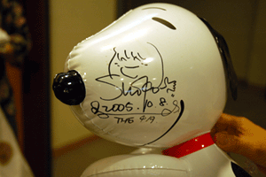 雨やどりの内山さんがゲットしたスヌーピーの風船に、TEH 4/9コンサート終了後、サインが入りました。左頬には沢田聖子さんのサイン。 |