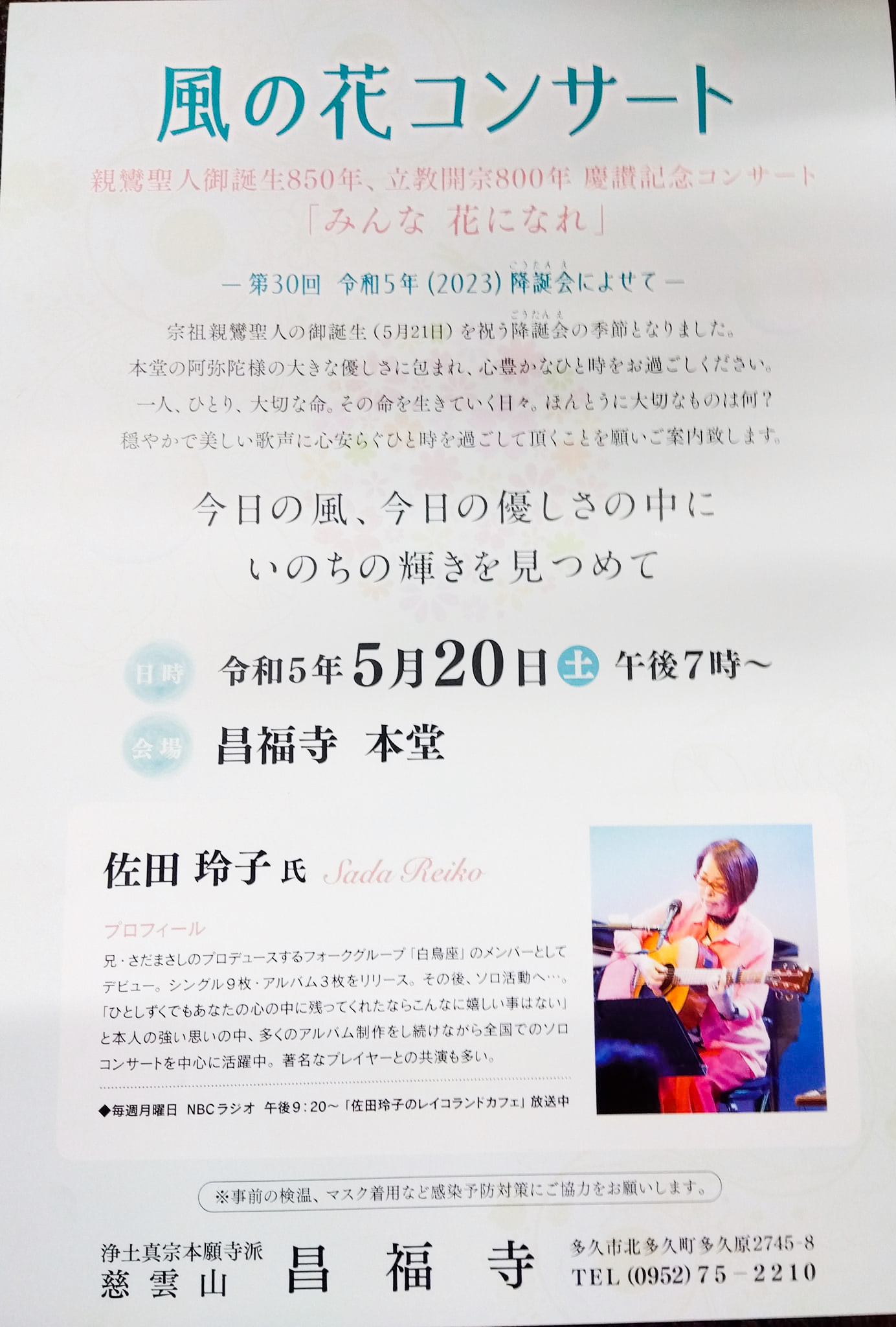 | 3年ぶりの佐田玲子ライブツアーのスケジュール 「バースデイライブ」 5月13日(土)、14日(日) 長崎☆自由飛行館. 「佐田玲子MY LIFEコンサート」 5月17日(火) 岡山城下公会堂 5月18日(水) 広島 LIVE JUKE 全てのお問い合わせとご予約 095-823-4134 ☆自由飛行館 佐田玲子オフィシャルサイト 香椎さだ研メンバーのyouさんが広島会場に参加。 夜景がきれいな会場だったようです。。 ![]() ![]() ![]() 久々のお寺のコンサート 「風の花コンサート」 令和5年5月20日(土) 午後7時〜 佐賀県多久市 昌福寺 本堂 (無料) お問い合わせ 0952-75-2210 レポート:いでぐち 昌福寺に行ってきました。お寺に到着したのは開演の約30分前。すでに車がたくさん入っている様子。誘導していただいて奥の民家の空いていたスペースに車をとめさせていただきました。すでに本堂には多くの方が座られていました。なんとか右前の方の席に座ることができました。その後も来場者が続いたため、ステージ前や右通路などに急遽椅子が増やされました。本堂に入りきれない方が外からも聴いていらっしゃったようです。住職のご挨拶やご本尊へのセレモニーがあり、お寺での開催ならではという始まり方でした。コンサートが始まったのは7時20分ころ。歌はもちろん楽しいトークもコンサートの楽しみです。やっとコロナが落ち着いてきたということで、会場の皆さんと一緒に歌うコーナーがあったりと、コロナ前に戻ってきた感じが伝わってきました。 1時間以上のコンサートのあと、CDの販売があり、並んでいましたが、数人前で売り切れてしまいました。また自由飛行館にいかねば・・・。 ![]() ![]() ![]() |