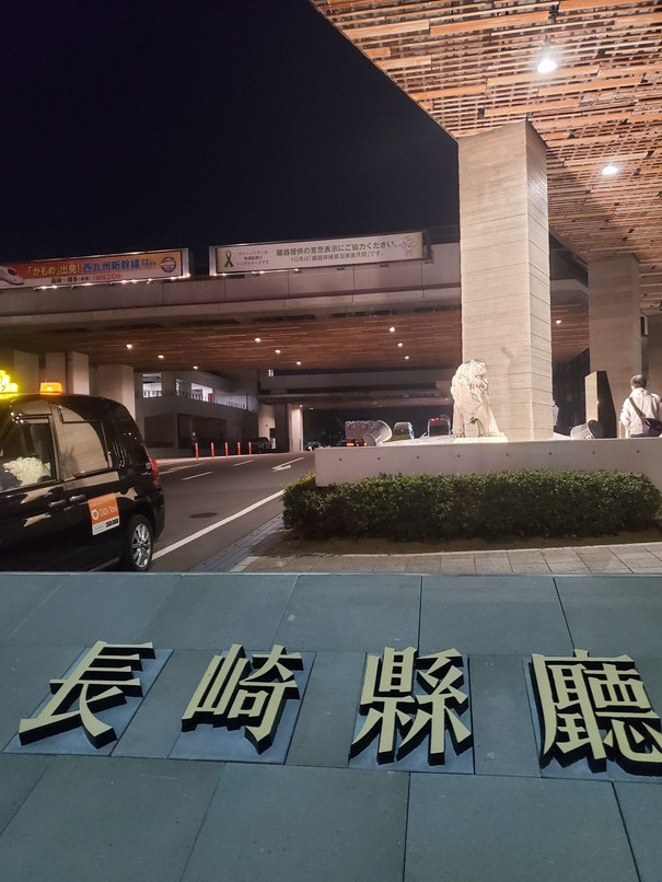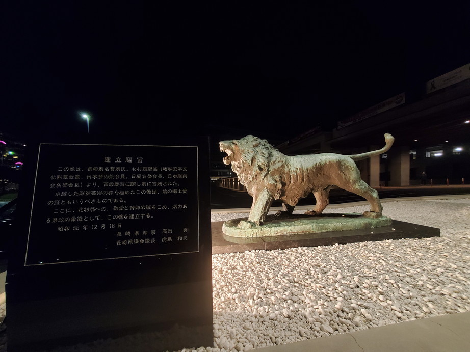 長崎県庁きれいですね。数年前に移転新築されたようです。出迎えてくれたのは、県庁そばに立つライオンです。